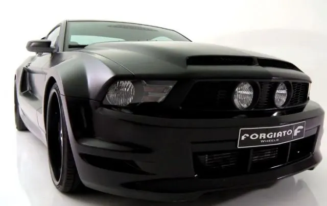Forgiato Wheels is the company behind this matte black Mustang, which boasts big wheels, a supercharged 5.0 engine, and a sinister look that commands a high price.