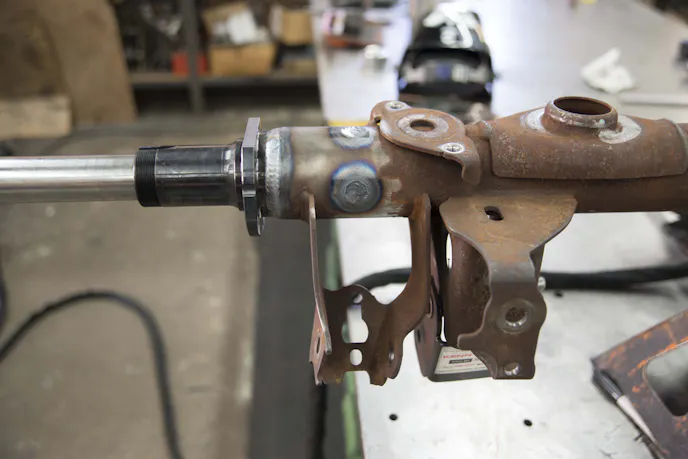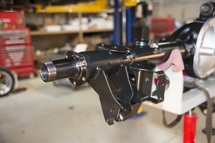 The area where a full-floating axle setup is altered from a traditional flanged axle is at the end. The rearend housing is shortened and a set of steel spindles is welded to the end with a jig, to give the new floater axle outer-end support.
