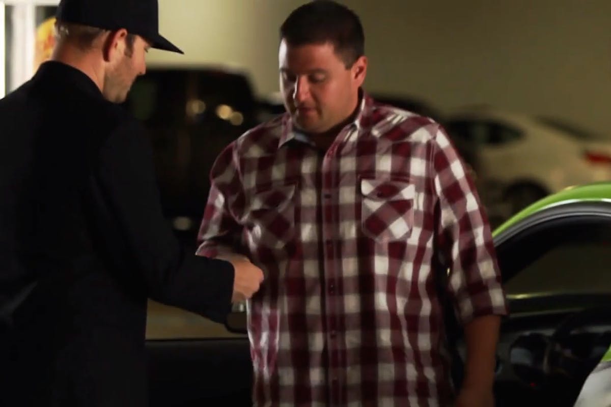 JTP hits the loud pedal and precisely slides the powerful ROUSH through the garage, navigating around concrete posts, and getting sideways as he proceeds up the ramps for each level. It all culminates in a few smokey 360s, and JTP parking the ROUSH next to his Falken sponsored Formula D ride. JTP gets out, dumps the valet jacket and clip on tie as he walks away.