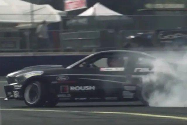They say, rubbin’ is racin’, and that holds true in this session of Formula Drift as both cars get together a couple of times. After a few rounds of making contact, they finally come together as JTP T-bones McQuarrie and makes a Camaro sandwich with his Mustang and the wall. But it’s all in good fun and the spirit of competition as JTP drives off throwing up more smoke.