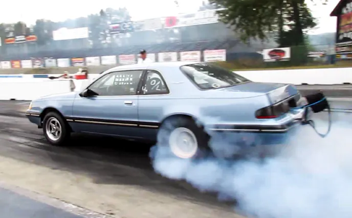 Forcefed Racing made a pretty radical ‘Frankenstein’ creation by mixing the 2JZ with the Thunderbird chassis. The video shows this combo works and this car straight boogies! Even during this license pass the car leaves wheels-up and gets sideways at half track. The driver shuts it down a litte early, coasting to a 9.51 at just over 100 mph, giving you some indication of the performance potential of this lethal combination. This car has been all the way down into the mid eights on this combo.