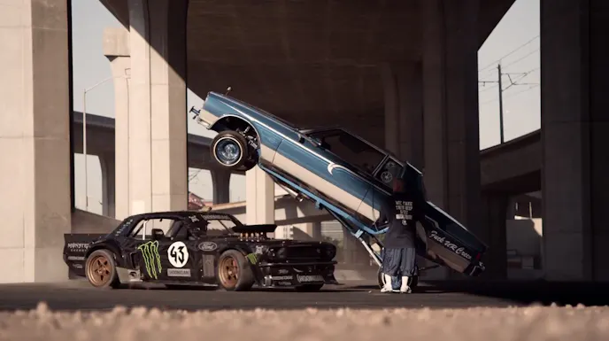 What car film wouldn’t be complete without involving the LA River, or any of the drainage system that runs through parts of the city. Block heads down there to splash in the water, and hoon circles around what appears to be the shell of a clapped out Subaru -possibly paying homage to where he got his start in rally driving. There’s even some hooning involving a bouncing low-rider, where Block actually slides his car under the front end of the bouncing car.