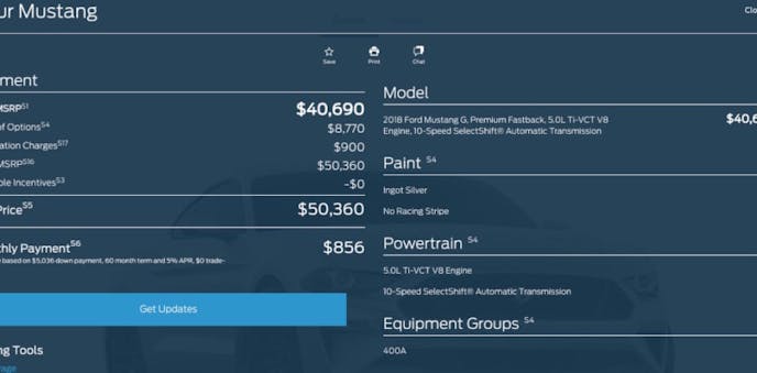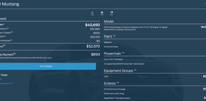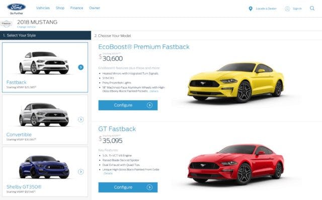 Today Ford launched its Build & Price website for the 2018 Mustang, which allows both potential buyers and dreamers to configure a Mustang with the options they desire and see how much it costs. You can also see what options are incompatible and what packages you must order to get the options you want, like clicking 401A to get that high-tech digital instrument cluster.