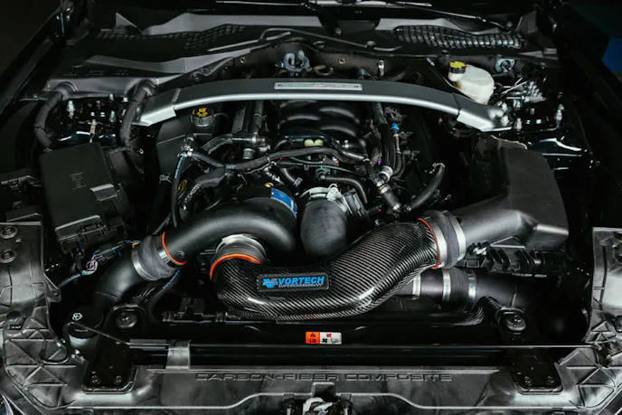 Ford’s performance division just keeps upping the ante, and the 5.2L Flat-Plane Crank Voodoo engine in the 2016 GT350 makes a bold statement. A high-revving track car for the street, the GT350 would be just as comfortable at Laguna Seca as it is in your driveway. Vortech Engineering has taken this spectacular platform to the next level with our new V-3 Supercharger System. With Billet Aluminum and Steel Supercharger mounting plates for rigid mounting, all aluminum mandrel belt tubing, and huge 900+ horsepower tested 24”L x 13” T x 3.5” Charge Cooler core, this system is ready to make power efficiently and reliably on your GT350 on the street or at the track.