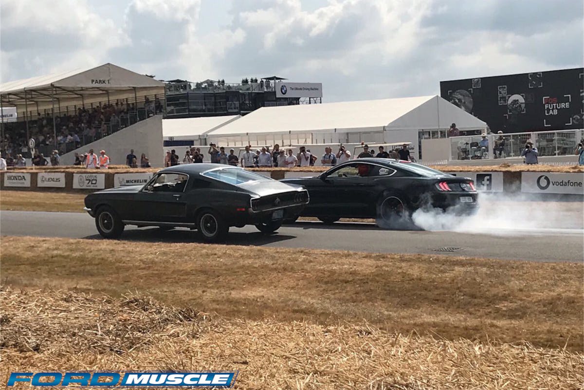 Stunt driver Paul Swift piloted the modern Mustang Bullitt and made a smoke show, while the original movie car kept the pace well below chase-scene speeds.