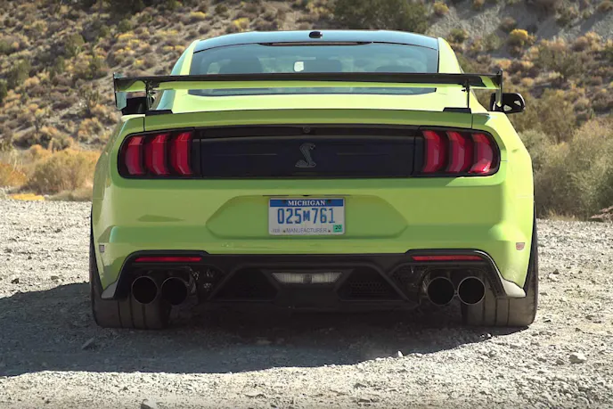 Once he finds an open area to stop, he proceeds to give us a complete walkaround of the car, noting the many advancements over the GT350 and even the previous GT500, including the advanced aerodynamics, braking, and cooling efficiency.