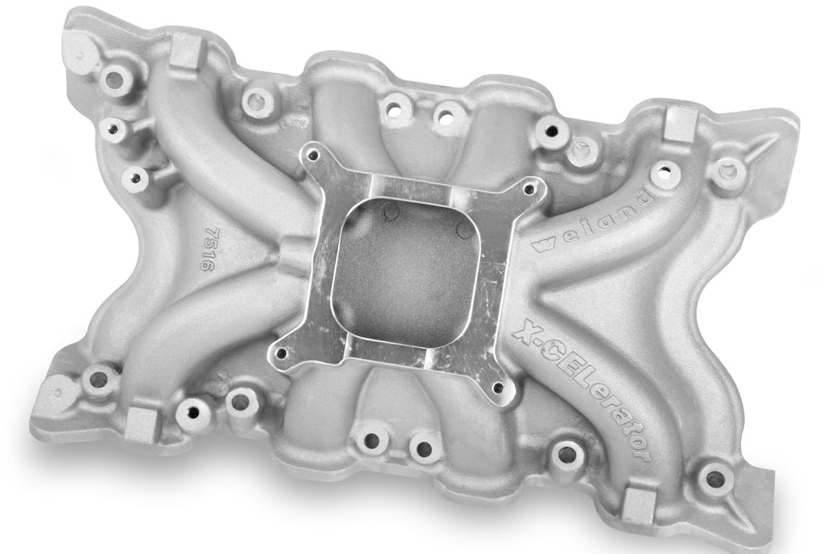 The Weiand X-CELerator single plane intake manifold for 2V headed Ford 351 Clevelands (PN 7516) has been re-tooled. That means the popular Ford intake is now even better looking and higher flowing than ever. A revised runner design smooths airflow while giving the intake an even better appearance. The Weiand 7516 is built to support engines with an operating RPM of 1,500-7,000 RPM with a square-bore carburetor.