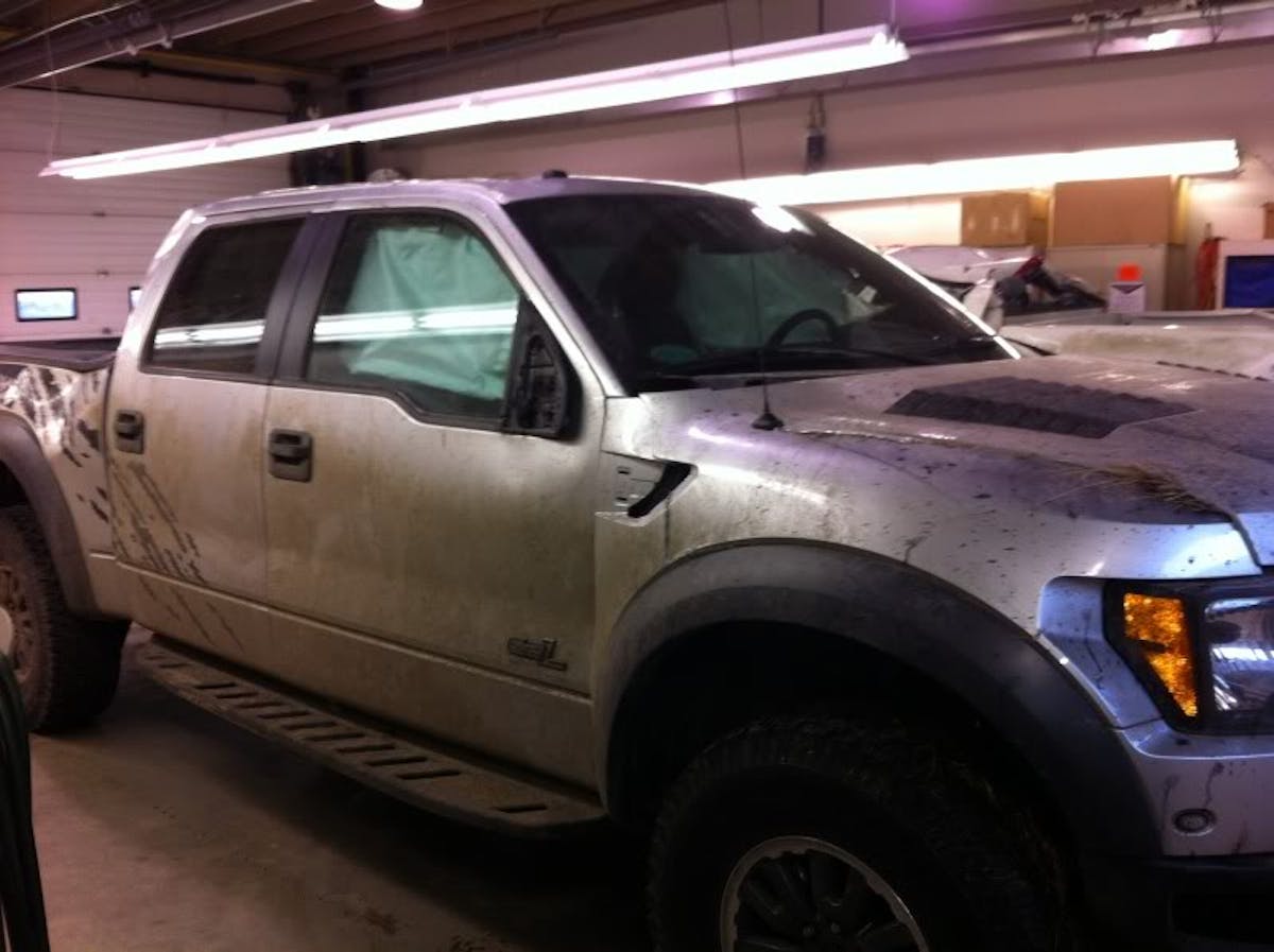 KaneNorth claims that under slippery conditions, he basically lost control of his Raptor and put it into a ditch, apparently from some black ice (the driver wasn’t alone in rolling his truck; ten other vehicles wound up in the same ditch that day). The driver and his passenger were OK, and as it turns out the Raptor wasn’t too bad either…especially compared to the white Dodge Ram that also flipped into the same ditch, albeit just once.