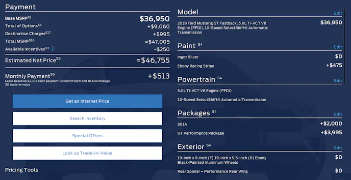 Ford recently launched the Build & Price site for the 2019 Mustang, which will hit the streets this summer. This site lets you easily point and click through the sometimes-complicated palette of options available on the latest pony car. This is quite helpful in planning such a major purchase with base prices ranging from $25,845 (for an EcoBoost fastback) to $46,595 (for a Bullitt) before destination and delivery.
