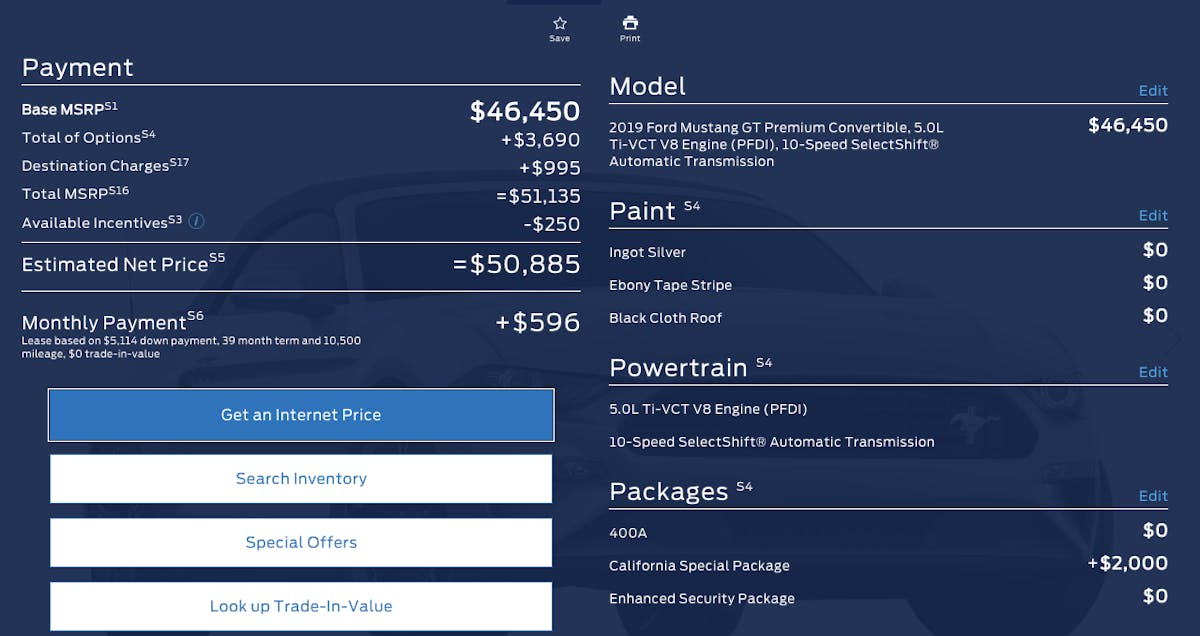 We ended up creating several versions worth considering, from a relatively low-optioned Mustang GT to a California Special convertible and from a Mustang GT with the Performance Pack Level 2 to the highly anticipated Bullitt. Interestingly, the Shelby GT350 isn’t yet available to build and price, which probably saved us from going down the rabbit hole even farther.