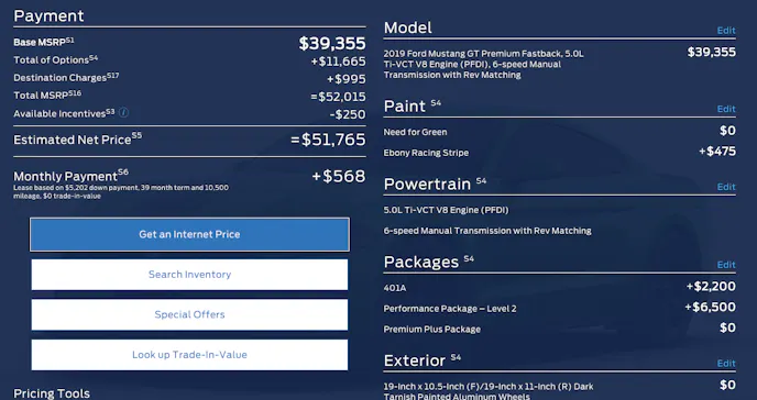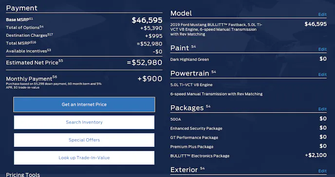 In the end, we built cars that ranged from around $46,000 for the PP1 Mustang GT with the automatic to about $53,000 for a nicely optioned Bullitt. The latest Mustang is a wonder, but the days of a cheap V8 pony car are behind us. If you are on a budget, EcoBoost is where it’s at, but the fun of the Build & Price site is dreaming and not sweating those option prices.