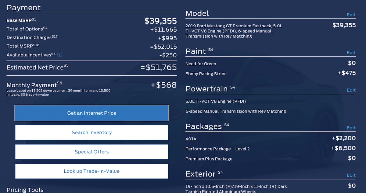 In the end, we built cars that ranged from around $46,000 for the PP1 Mustang GT with the automatic to about $53,000 for a nicely optioned Bullitt. The latest Mustang is a wonder, but the days of a cheap V8 pony car are behind us. If you are on a budget, EcoBoost is where it’s at, but the fun of the Build & Price site is dreaming and not sweating those option prices.