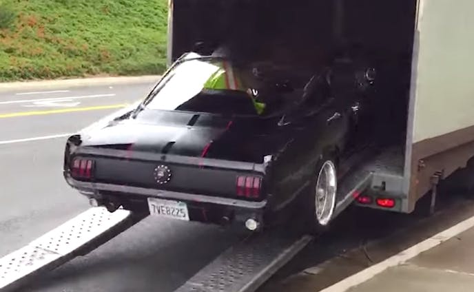 As you can see in the video above, a driver from a transportation company got a little to happy with the gas pedal, spun the tires on the ramps and got the car sideways as it headed onto the trailer. That’s when the bad things happened as the classic Mustang clashed with the trailer.