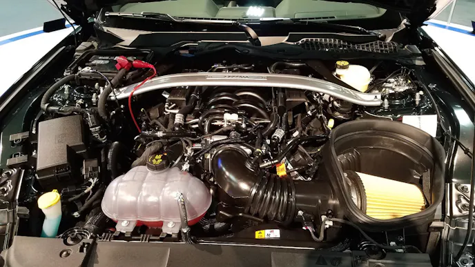 As you may recall, the Gen3 Coyote 5.0-liter in the Bullitt is upgraded with Shelby GT350 induction — cold air, throttle body, and intake manifold — and programmed with a unique calibration. All told it is said to deliver 480 horsepower and 420 lb-ft of torque and push the car 8 MPH faster than the Mustang GT to a top speed of 163 MPH.