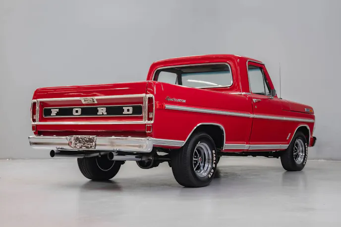 Under the hood of this 1970 F-100 Sport Custom is a 427 cubic-inch engine that pays homage to the Thunderbolt-era. The large cubic-inch FE engine is equipped with two four-barrel Holley carburetors, aluminum intake manifold, and stainless tube headers. The engine combination produces a healthy 400 horsepower.