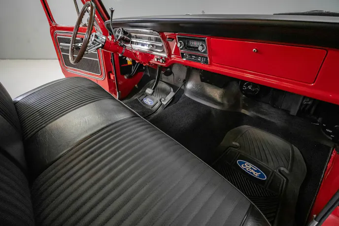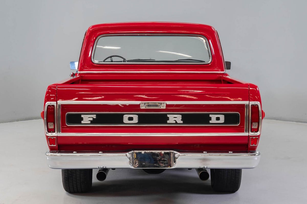 Inside the cab, the interior is reupholstered in black with custom door cards. A padded dash displays all the vital signs Ford included back in 1970. Once you’ve reached your destinations and wish to hear some tunes, simply turn on the resto-styled AM/FM unit.