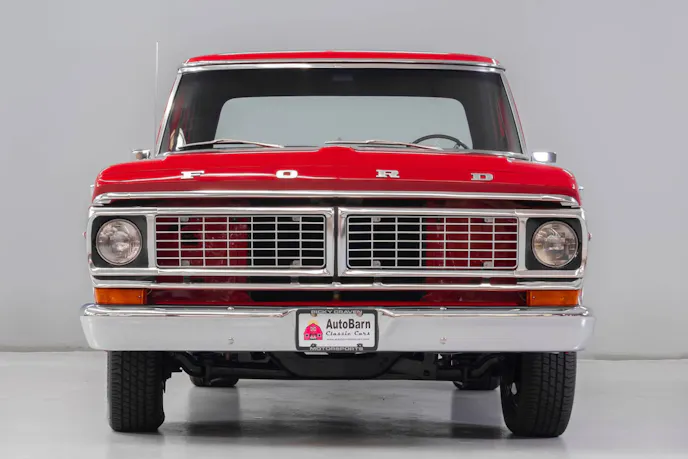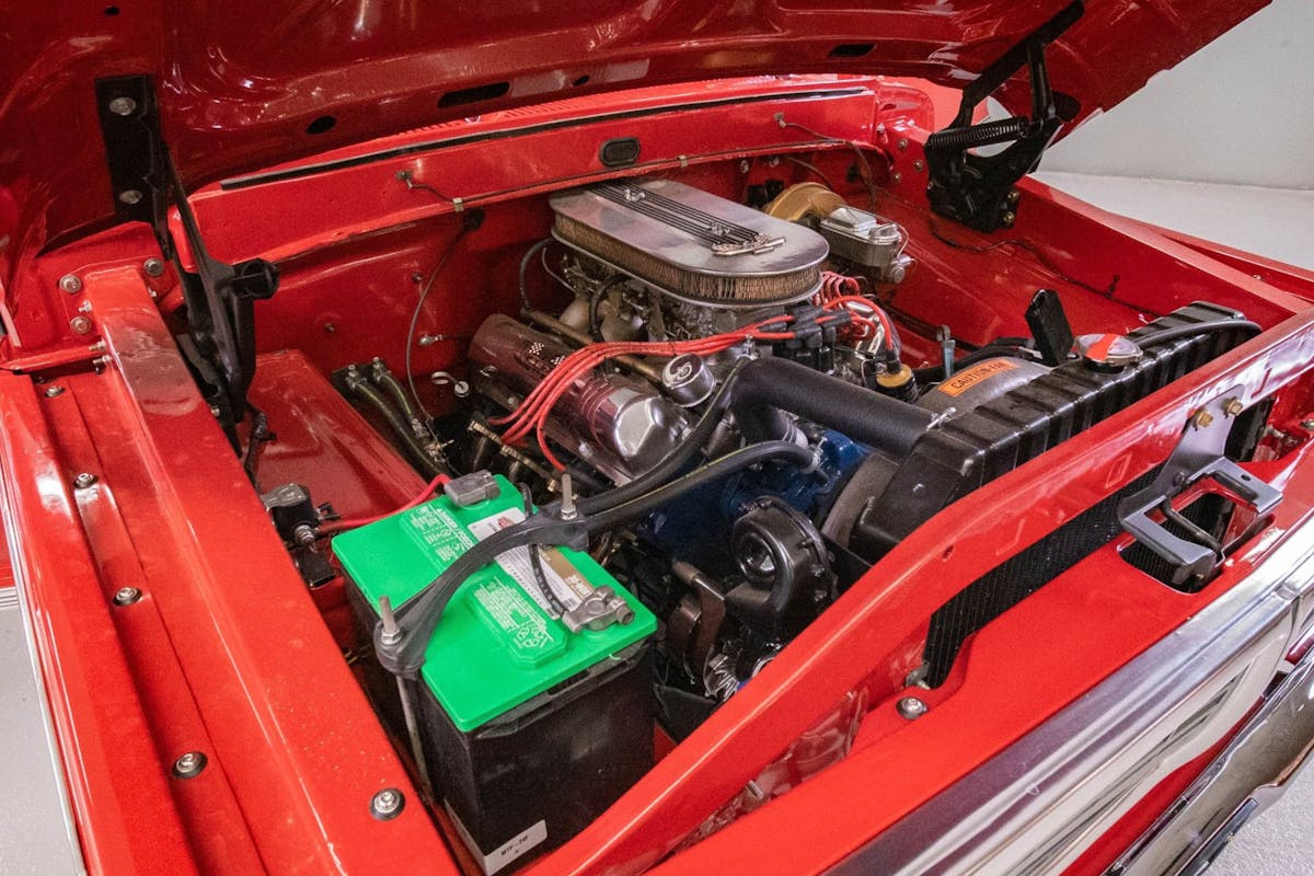 Under the hood of this 1970 F-100 Sport Custom is a 427 cubic-inch engine that pays homage to the Thunderbolt-era. The large cubic-inch FE engine is equipped with two four-barrel Holley carburetors, aluminum intake manifold, and stainless tube headers. The engine combination produces a healthy 400 horsepower.