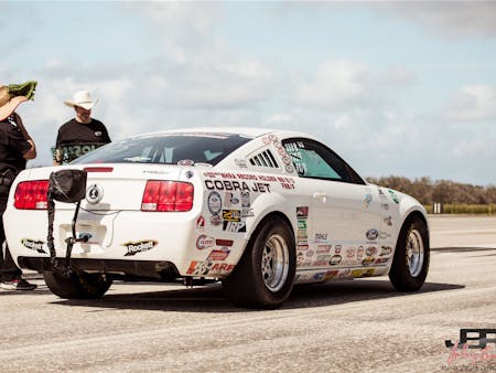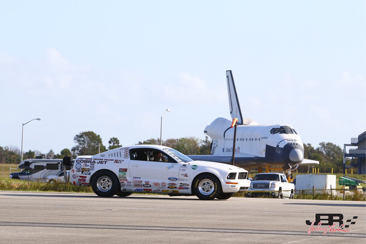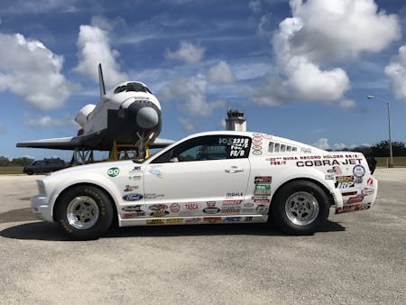 The Space Shuttle might be retired, but every so often there are land-based rocket ships blasting down its expansive concrete landing strip. On such ride is a factory-prepped drag car that was tweaked for top-speed duty. This 2008 Cobra Jet recently returned to beat its own standing-mile record.
