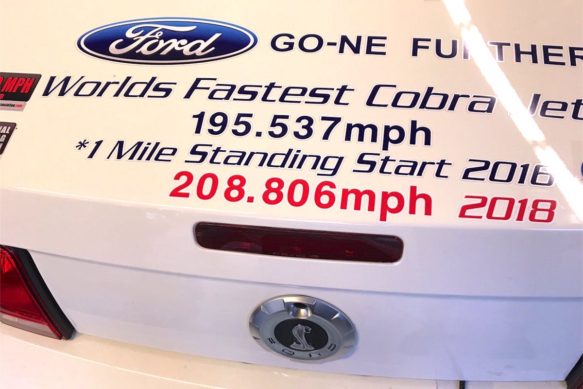 “The 208.806-MPH hit was only the fourth standing-mile run on the car,” Chris added. “Next up will be a switch to Super Cobra Jet specs using a 4.0-liter Whipple. Can you say 230 MPH?”