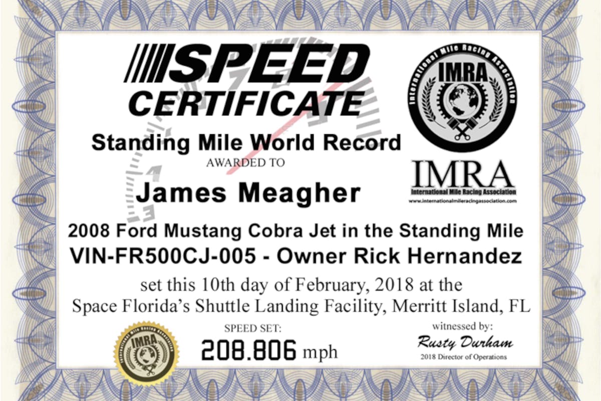 “We performed a standing one-mile top speed test with a real NHRA-legal 2008 Cobra Jet Mustang, VIN 005,” Chris Johnson, founder of JMS and SCT Performance, said. “We reset the record for the world’s fastest Cobra Jet Mustang in the standing mile at 208.806 MPH.”