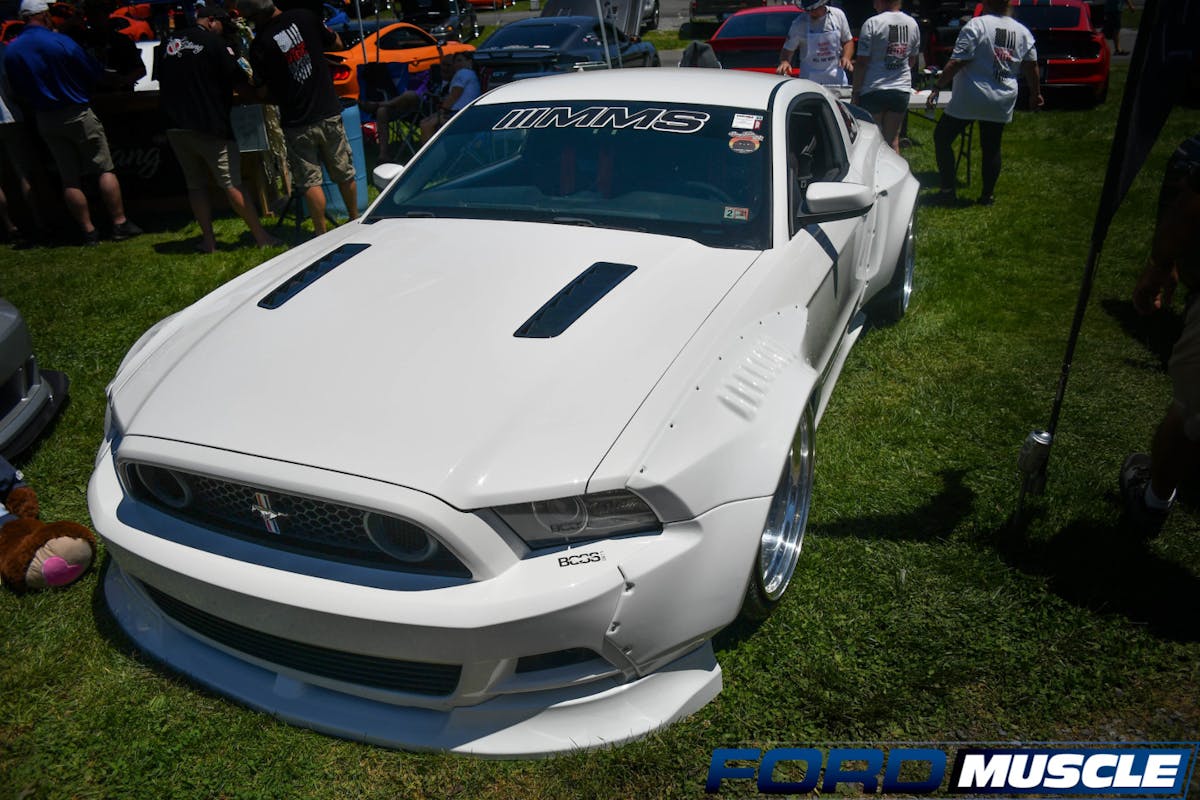 The Mustang comes from the factory with a pretty low ride height, however, taking it up a notch is the owner of this white S197 Mustang. To keep the wide wheels from poking out past the wheel well, a set of super-wide flares were installed. The addition of a front spoiler and side skirts make this futuristic Mustang look out of this world.
