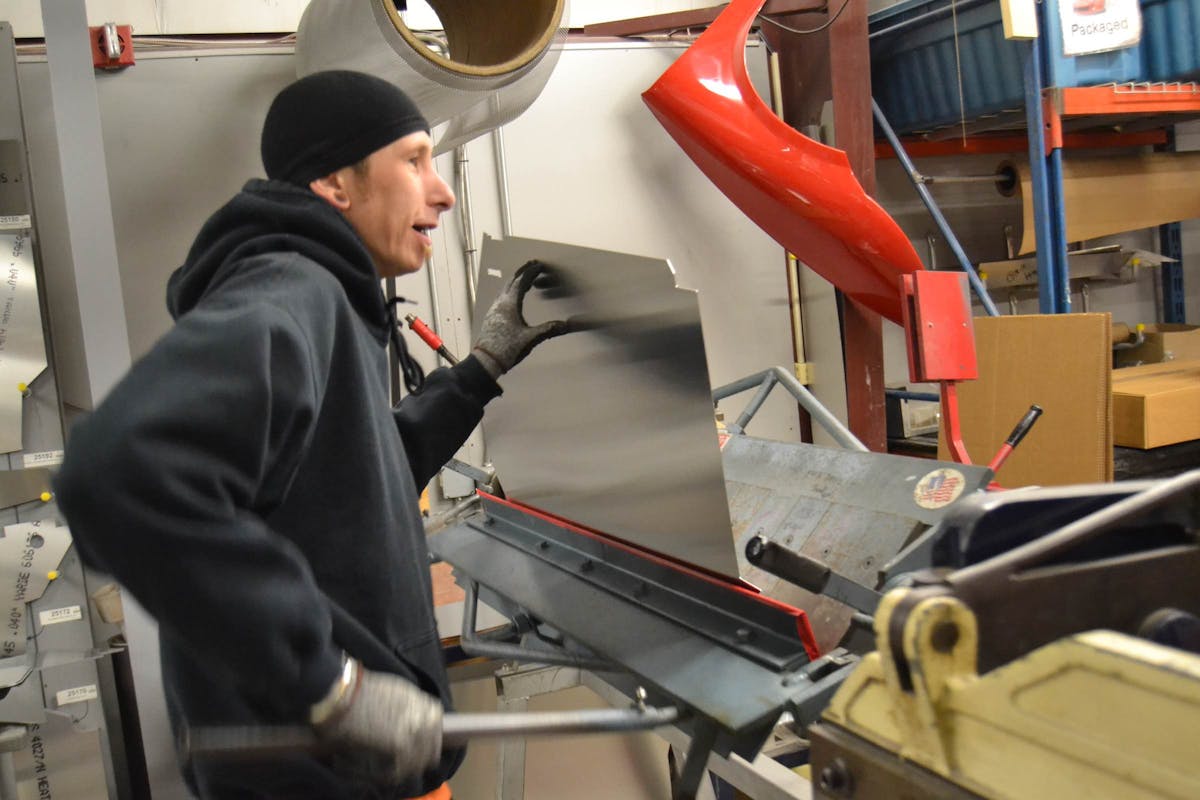 Today the Factory Five crew is making our sheet metal panels. Each panel is CNC cut, formed by hand, tested for fitment, then sheet metal screws are used to hold them in place. This way FFR can guarantee panel fitment. Since we are installing a Coyote, the foot box is slightly smaller to make way for the larger engine.