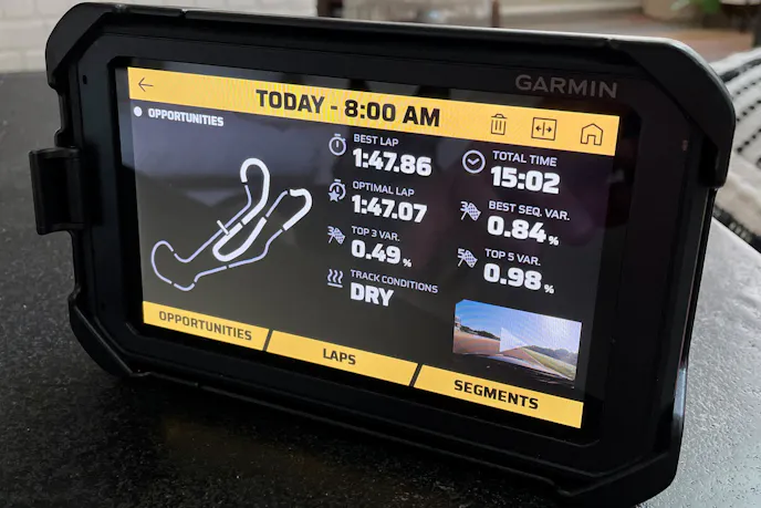 The advice from the Garmin Catalyst did not take long to pay off. Our second session saw a drop of 5.54 seconds in lap time compared to our first. The difference in lap times pushed us to further trust the Garmin, and it quickly became our digital driving coach for the weekend.