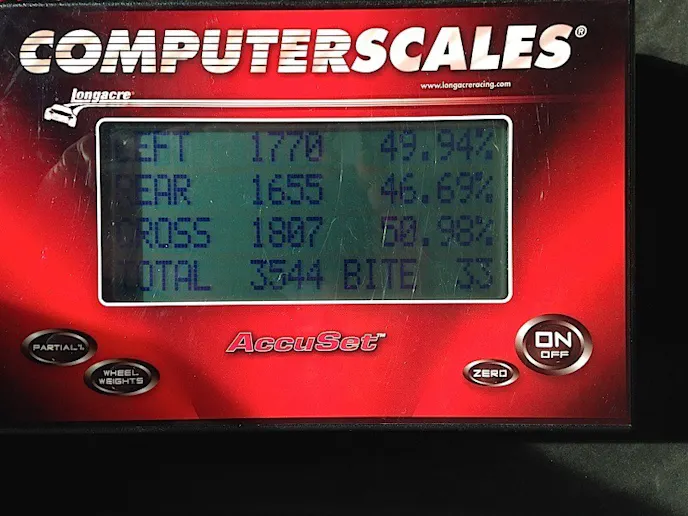 Our first order of business for the day was to get the car scaled. With our gasoline gauge pointing right at the 1/4 mark upon arrival at the shop, we jacked up each wheel and placed it on a scale. The final result was a weight of 3,544 pounds. The weight is split 1,888.7 pounds front and 1,655.3 pounds rear. That’s a balance of 53/47 -not the 51/49 we’d hoped to be much closer to, but definitely a starting point we can work with.