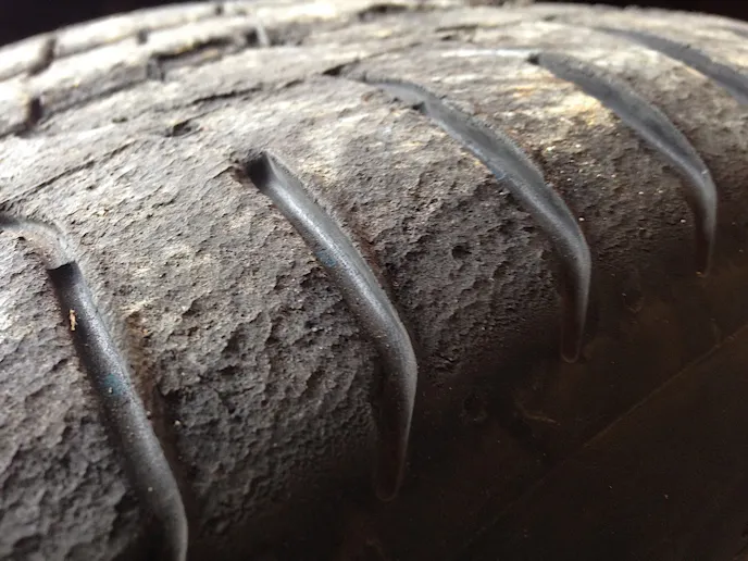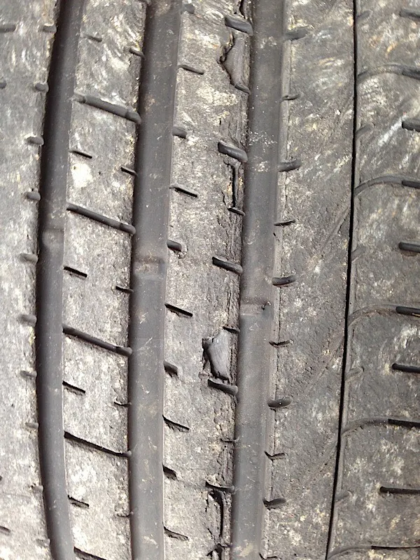 After over 60 trips around the autocross, and far too much heat cycling, the stock Pirellis are now a casualty of competition. Although they have a 220 treadwear, making their tread fairly shallow, the compound didn’t fare well under the stress. The tires have cupped severely, and the centers of the tires now have chunks missing.