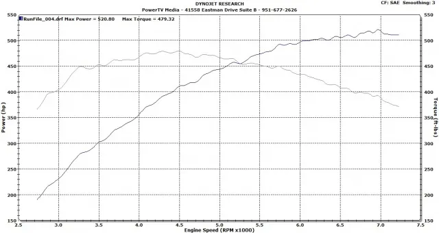 On the dyno, we got the results we were expecting. While the headers did not pick up a huge amount of horsepower, the reduction in back pressure from the restrictive factory pipes to the Kooks free-flowing pieces dropped our boost level. We picked up 12.1 hp and 13.4 ft-lbs of torque with decent gains across the entire RPM range. This brings our peak power numbers to 502.2 hp and 451.5 ft-lbs. With the reduction in boost, we’re not working the engine as hard, yet making more power. And the sound difference is nothing short of astounding – check out the video for a taste of Kooks-equipped, quad-cam Coyote goodness.