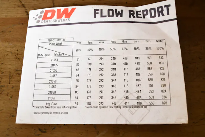 The troubling 20-percent variance I had experienced in the past was successfully addressed with the flow report from Deatschwerks. At 100 percent the injectors varied between 78.- and 79.3 pounds, a mere 1.08 percent difference between the two outliers. The average flow rate between the injectors at static was 78.9 pounds, even overstepping their advertised size.