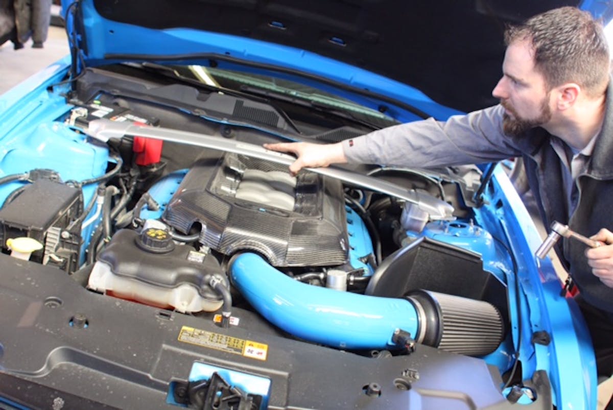 In preparation for the mounting of the ProCharger P-1SC-1 supercharger, we pre-emptively replaced the 2011 Mustang’s stock bushings to with UPR‘s Adjustable Motor Mounts. Adjustable in ¼-inch increments from stock engine height to a ¾-inch drop, they offer additional hood clearance and lower the centre of gravity in the process. Featuring Energy Suspension Urethane bushings and CNC machined 7075 Billet Aluminum, they are the strongest and most versatile bushings on the market.These additions are pieces of the Project Grabbr performance puzzle which will soon include the installation of a ProCharger P-1SC-1 supercharger, along with the required tuning. More details on that in a later installment. We rolled our Grabber Blue S197 onto the dyno before the installation and again afterward to get an idea of the real-world gains one can expect from swapping from the factory short-tube headers and catalytic-converter-equipped H-pipe to these aftermarket parts.The headers are 1-7/8-inch, full length, fully-polished headers constructed from 304 stainless steel. The matching 304 stainless steel mandrel-bent 3-inch H-pipe helps us complete the installation. The main reason for choosing this particular setup was due to the V-band connections at the H-pipe, as this should eliminate any potential exhaust leak issues. JBA has been developing and manufacturing exhaust systems for over 22 years and is well known for its Cat4ward headers with the JBA Firecone. Their merged collectors greatly improve the engine’s volumetric efficiency.