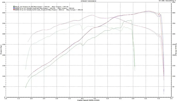 As part of the Trinity article, we used the pre-installed tune from Diablosport, changed the options to account for our cold-air kit, and rolled the BAMA Dynojet to 394.4 hp and 375.4 ft-lbs of torque.