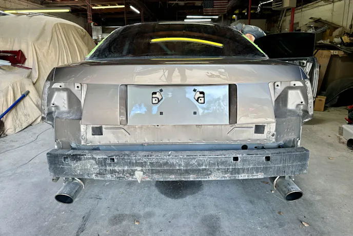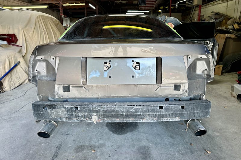 Tim began the process by removing the tail lights, bumpers, and exterior trim pieces. Once the car looked like a theft recovery, It was then time to sand down and fill in the areas where Mother Nature had left her marks on the chassis. As previously mentioned, the trunk lid’s third brake light, keyhole, and wing mounts were on the list to be filled in. The Carter’s Customs vent was slated for reinstallation, but this time, the gap between the vent and the front of the hood would be filled in, creating the desired GT500-like aesthetics. Given that the car would primarily see track use, there was no need to retain pesky license plate bolt holes.