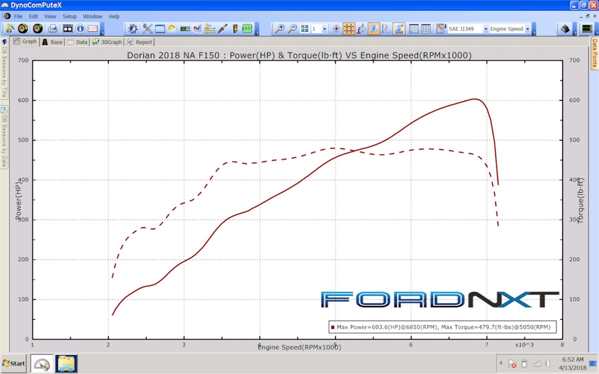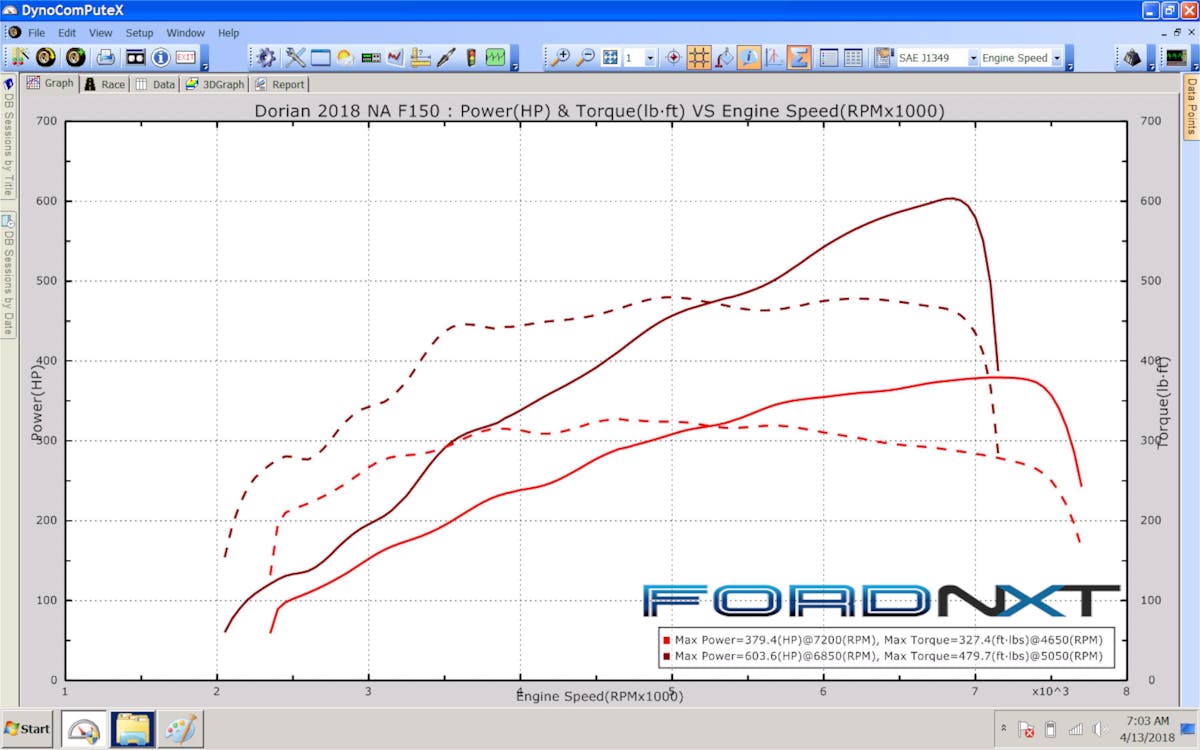 In naturally aspirated form, Dorian’s 2018 F-150 Black regular cab FX4 put down 379.4 horsepower and 327.4 lb-ft of torque at the wheels. Bolting on the Whipple Gen 3 tacked on an additional 224.2 horsepower and 152.3 lb-ft of torque at the wheels. These pulls were made in Fifth gear rather than the preferred Seventh gear (which is 1:1), to prevent hitting the speed limiter on the dyno.