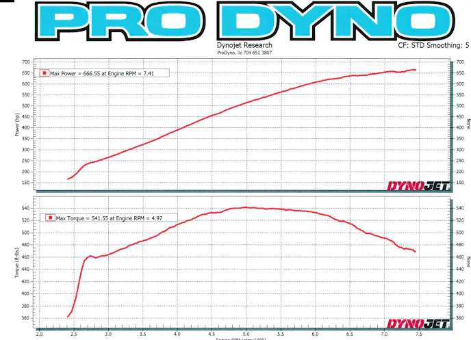 What came next, I didn’t expect. After trying a few different things with the tune to isolate that it was, in fact, a fuel quality issue, Dan grabbed a can of Boostane he had on the shelf and poured it into the tank. He fired up the VMP-boosted Coyote one more time, and it screamed to just shy of 7,500 rpm. Welp, our knock issue was gone – 666.55 horsepower at 7,410 rpm and 541.55 lb-ft of torque, according to Pro Dyno’s Dynojet. Now we’re “cookin’!” With a healthy transmission, Kooks long-tubes and exhaust, and Pro Dyno’s tuning, we picked up 87 horsepower and 27 lb-ft of torque at peak.