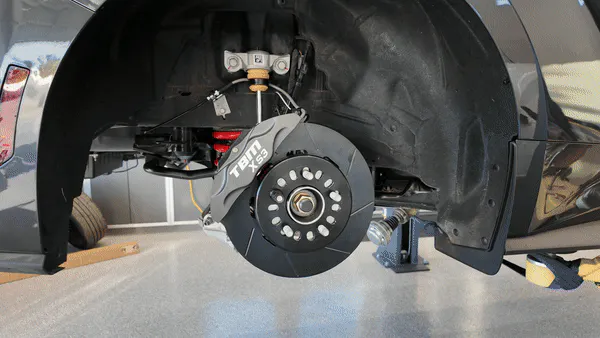 Our excitement quickly faded when we saw just how far we were from fitting the wheels over the enlarged brake calipers and clearing the rear knuckle. Once again, we found ourselves questioning whether starting with the Performance Pack was the best choice for drag racing — especially given how many of its defining features we’re now changing. Time to break out the grinder and ear protection…just kidding! Kind of…