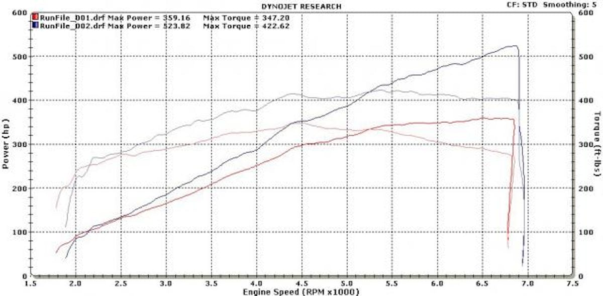 On an otherwise stock motor, the 72mm system produces 672 horsepower at the crank on 6 pounds of boost, and with a built motor has churned out over 750 at the wheels on 14 pounds of boost.