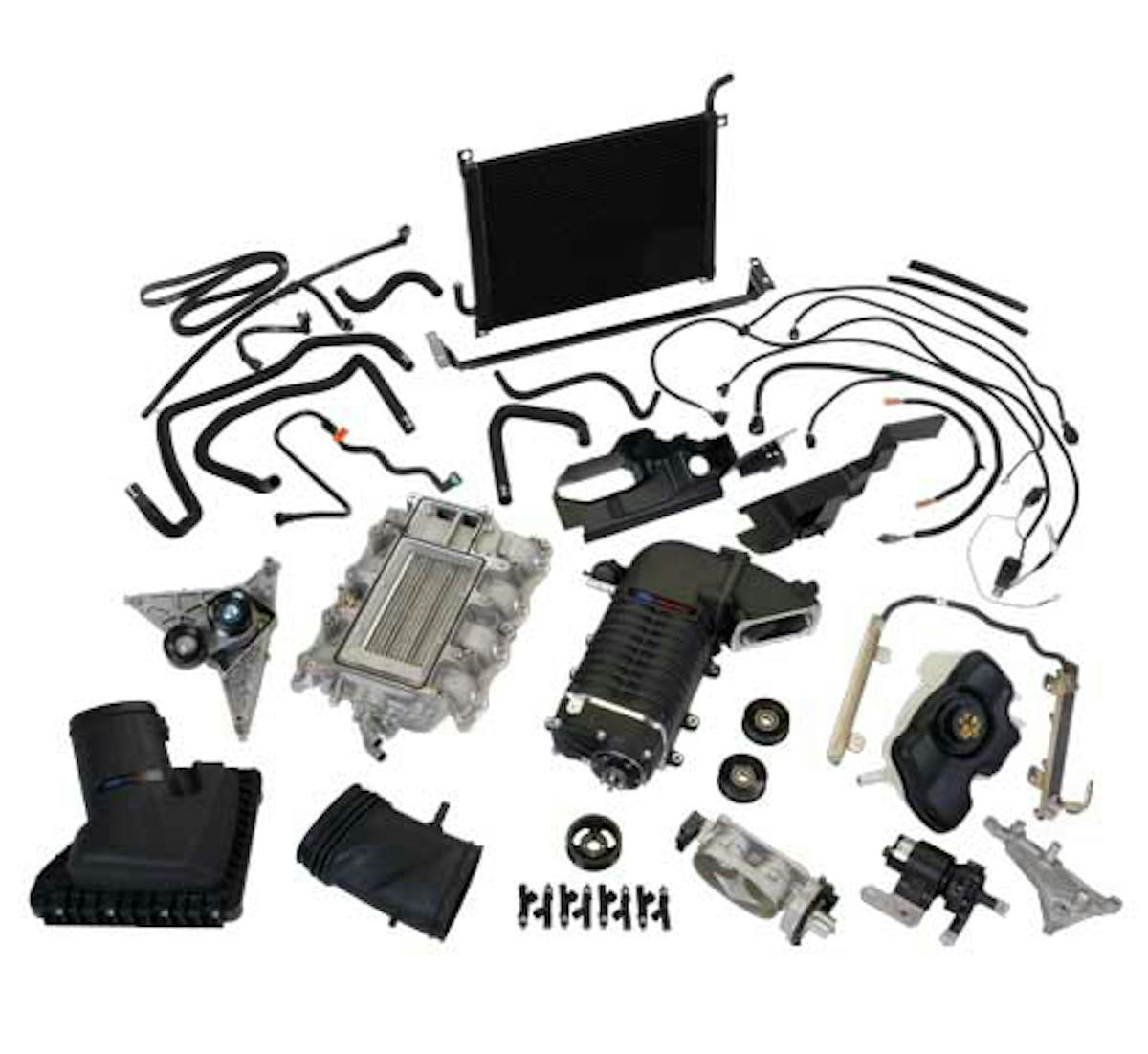 The kit features an Eaton TVS rotor-based supercharger, along with a large intercooler, intercooler water pump, fuel injectors, fuel rails, a handheld calibration module with preloaded tunes, and all belts, tensioners, hoses, and other necessary components that make this a complete, ready-to-install kit.