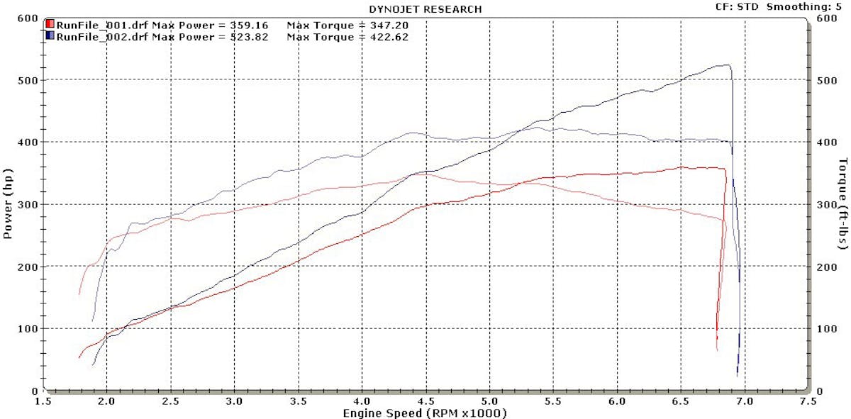 At 10 pounds of boost, the RoushCharger produces 525 rear wheel horsepower at 6,700 RPM and 465 ft-lbs of torque at 4,700 RPM.