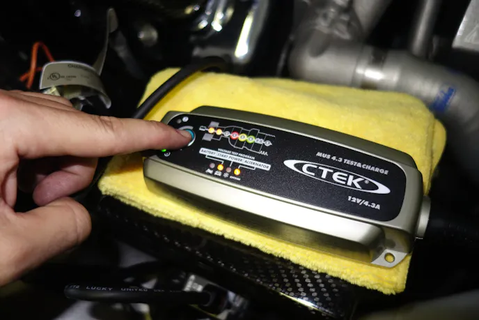 With everything wired up, we plugged in the CTEK MUS 4.3 to the Comfort Connect Panel, toggled through the options until arriving at those for an automotive battery, plugged it into an outlet and let it get to work.