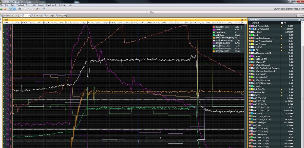 “Any AEM gauges that you have, especially the new X-series CAN bus stuff, don’t take up any inputs on the box,” Eric enthused. “You can just CAN them directly into the logger and you, essentially, have a free channel.”