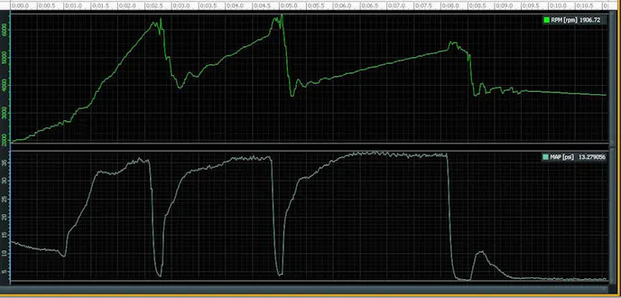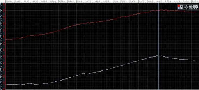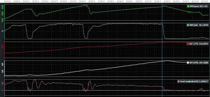 This particular screen shot is of our air inlet temperature (AIT) sensors on the same acceleration run we used above. We’ve overlaid them on the same scale to show the difference between hot and cold AIT on acceleration. This is an easy way to gauge how well our OEM intercooler functions, and how hot the hot side plumbing from our turbo gets. Notice that temperature differences under acceleration remain about 70 to 80 degrees apart for the duration of our test. Ambient temperatures during this time were around 90 degrees Fahrenheit.