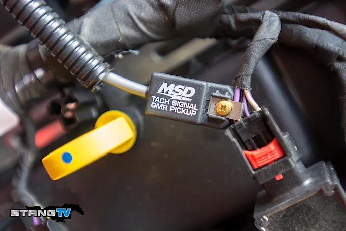 Like all modern Ford vehicles, our 2015 Mustang EcoBoost uses a coil over plug (COP) ignition system. To get an RPM signal for our AQ-1 we’re left with only a few choices. We can try to tap into the RPM signal via the PCM harness, or we can go to the coil. Ford COP ignition does not provide a square wave signal needed for the AQ-1. To get that, we turned to MSD for a GMR pickup. This device works like a powered sensor, we supplied sensor power and ground via the AQ-1, and then connected the sensor output wire to input channel six on the AQ-1. The GMR pickup clamps around one of the wires on the cylinder one ignition coil, capturing the signal and converting it to a square wave that the AQ-1 can identify.The AQ-1 is also handy for troubleshooting. Suppose your car is on the run of its life at the drag strip or race track. Suddenly there’s a problem, a sudden loss of power  -what happened? Back in the pits, without data to analyze, you’re left only guessing and using whatever tools you have on hand at the track to take a stab at resolving the issue. Maybe your nitrous or water methanol kicked off? Maybe something is wrong in your forced induction system and boost is dropping? Using the AQ-1 along with AEM data, owners can see exactly when a problem may have occurred.