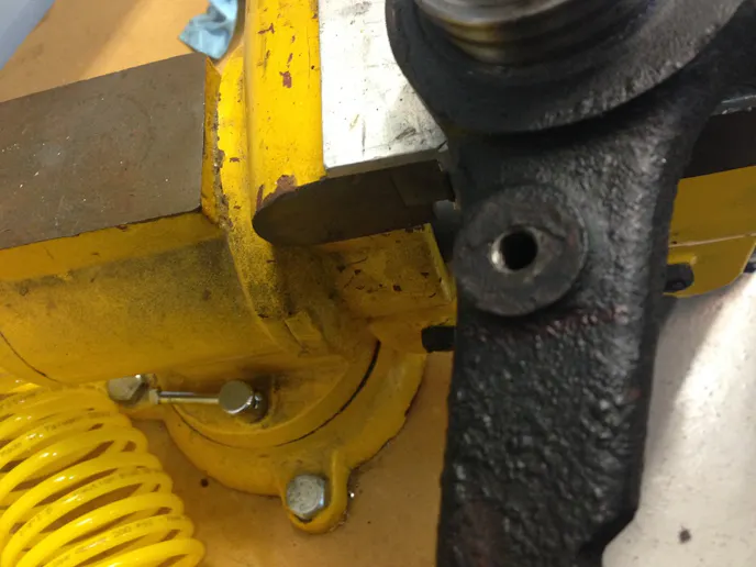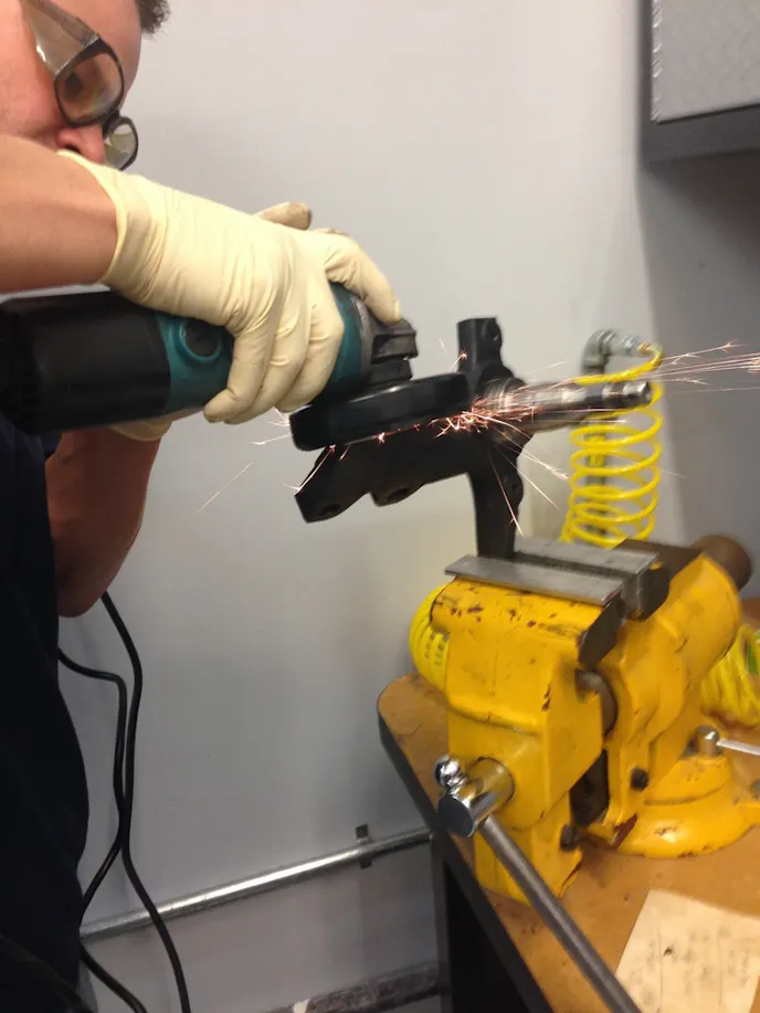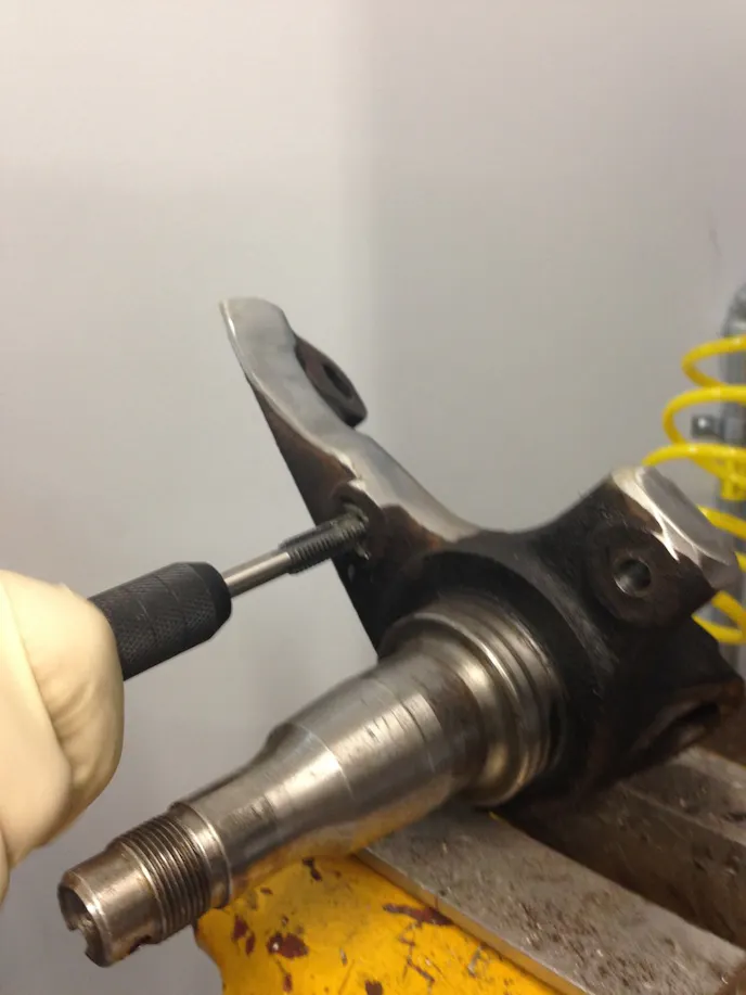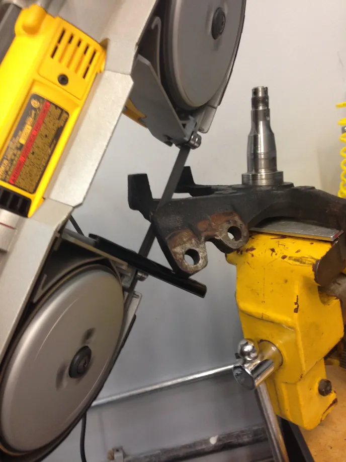 First, Jovanis said that the Fox spindle had to be modified. The factory caliper mounting ears were marked and removed. Jovanis utilized a porta-band saw for this part. A grinder was used to clean up the raw cuts, making the spindle look neat and clean. The dust shield bolt holes needed to be tapped after being drilled to a larger diameter.