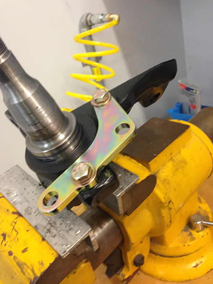Moving the caliper in-board for wheel clearance means that A-arm clearance must be verified once the car is back on all fours. Jovanis’ Fox was equipped with an older Flaming River manual steering rack which had no limiters, allowing for a broad range of motion. Jovanis added limiters to keep the caliper and bracket away from the A-arm, and noted that because the Fox has a spool and manual steering, this didn’t really make a practical difference.