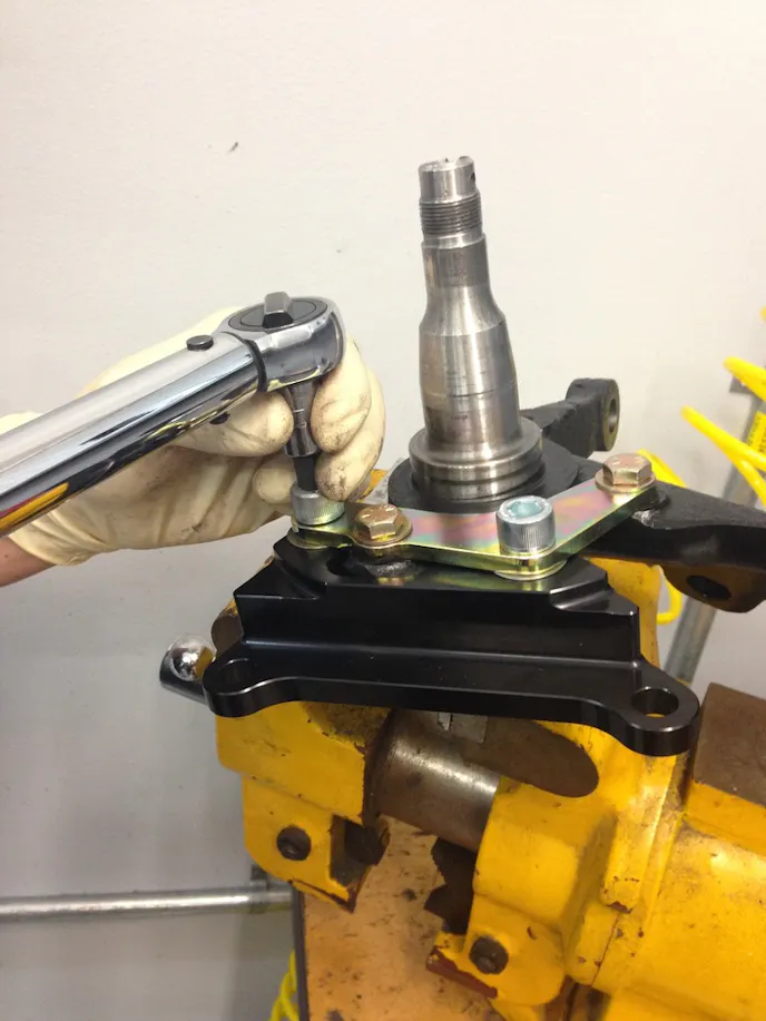 Then, Jovanis could get started on assembling the brake system onto the spindle. He began by laying out the small parts. The mild steel bracket was installed by mounting to the bolt holes that were tapped. Next, the black anodized billet intermediate bracket was mounted to the mild steel bracket.