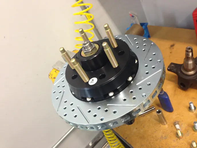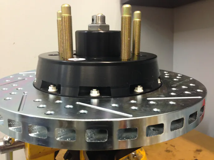 The Fox spindle was converted to use a hub that allows a slip-on rotor. The hub in question is anodized billet aluminum and comes assembled with pre-packed bearings for an easy installation. The rotor was then test fit.