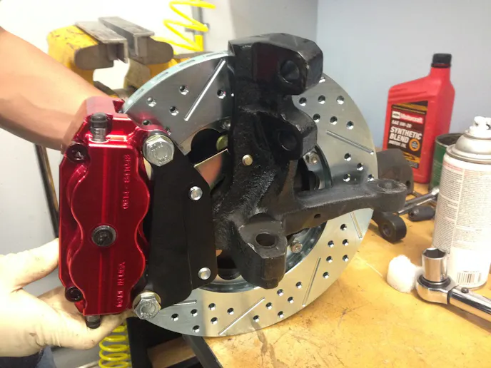 The resulting geometry is better for drag racing in both the bump steer and caster departments and is available starting at around $1,095.00 depending on options like caliper color, rotor finish, and more. Baer offers two configurations for this kit: one for 1987-1993 Mustang spindles, and the other for the Racecraft 2-inch drop spindle. The caliper placement is optimized for each configuration. In the following pictures, you’ll see the Fox spindle bracket, which is different from the Racecraft 2-inch drop spindle bracket in that it rotates the caliper upward.
