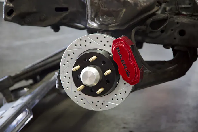 The included calipers are of the S4 variety and feature four 10mm cross bolts for maximum stiffness, as well as stainless steel abutments and noise suppression springs. The calipers were designed with an internal crossover design and feature dust and weather seals, as well as hard anodized aluminum pistons. A common 4-piston pad is utilized for easy replacement. Correct banjo style fittings are used in place of pipe thread. Baer offers custom colors, though clear or Fire Red are standard, and the machined Baer logo is hand painted. Perhaps best of all, the calipers are 100% made in the USA from US-sourced materials.